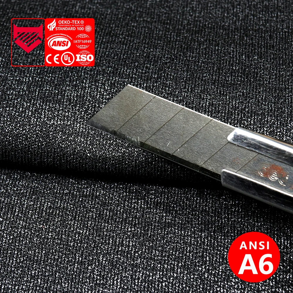 - Gebruik: E gegroot vir hoëvlakke snyresistensie (ANSI A6), is hierdie swaarwerk-stof ideaal vir beskermende schorters, nekskermers en ander veiligheidsuitrusting wat verbeterde duursaamheid en verdediging vereis.