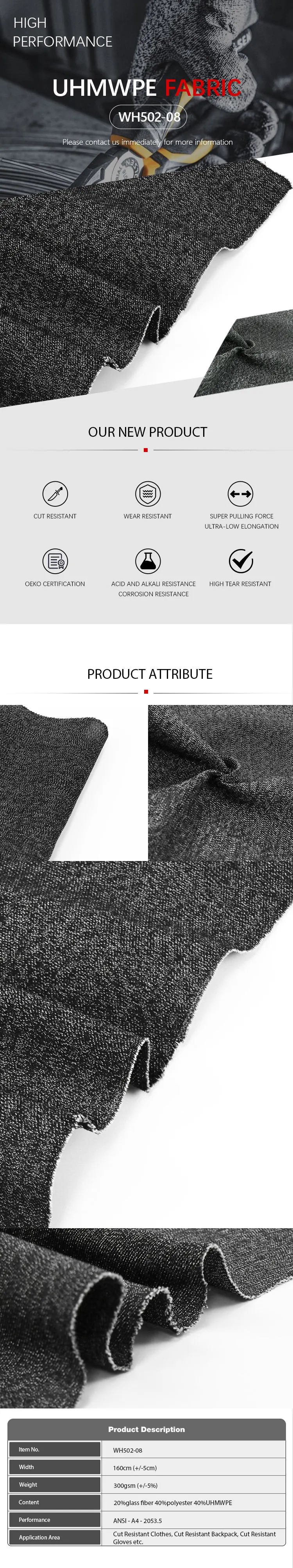 HPPE + Poliészter + Üvegszál Vágási Ellenálló Szövet (Modellszám: WH502-08) egy többkomponensű védőszövet, amely HPPE-t, poliésztert és üvegszálat kombinál, fokozott vágási ellenállás érdekében. Szélessége 160 cm, súlya 300 g/m², így ötvözi a tartósságot és a praktikus használhatóságot.